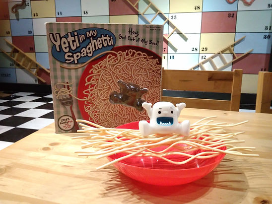 Tempatkan mie di atas mangkuk dan duduk Yeti di atas Bergiliran tarik mie satu per satu tanpa membiarkan Yeti jatuh!